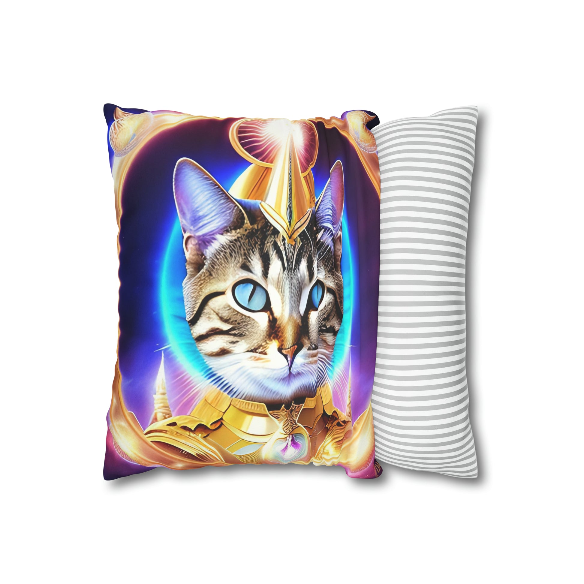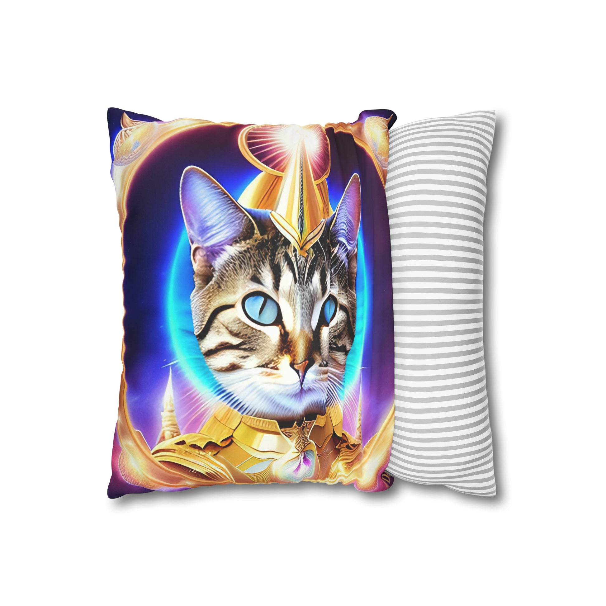 A definite statement piece, this indoor, 100% faux suede, double-sided print pillow cover is avaliable in various sizes and features a colorfully vivid spiritual portrait of a brown gray tabby cat in ornate golden armor surrounded by a light blue hydroplasma etheric aura signifying attaintmment as a relaized merkaba master of the light body link to Earth's energy force field and sentient life's Maharaic Shield.