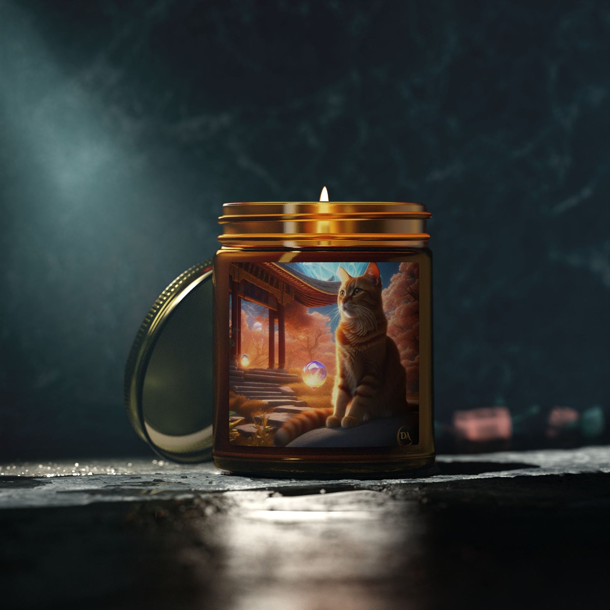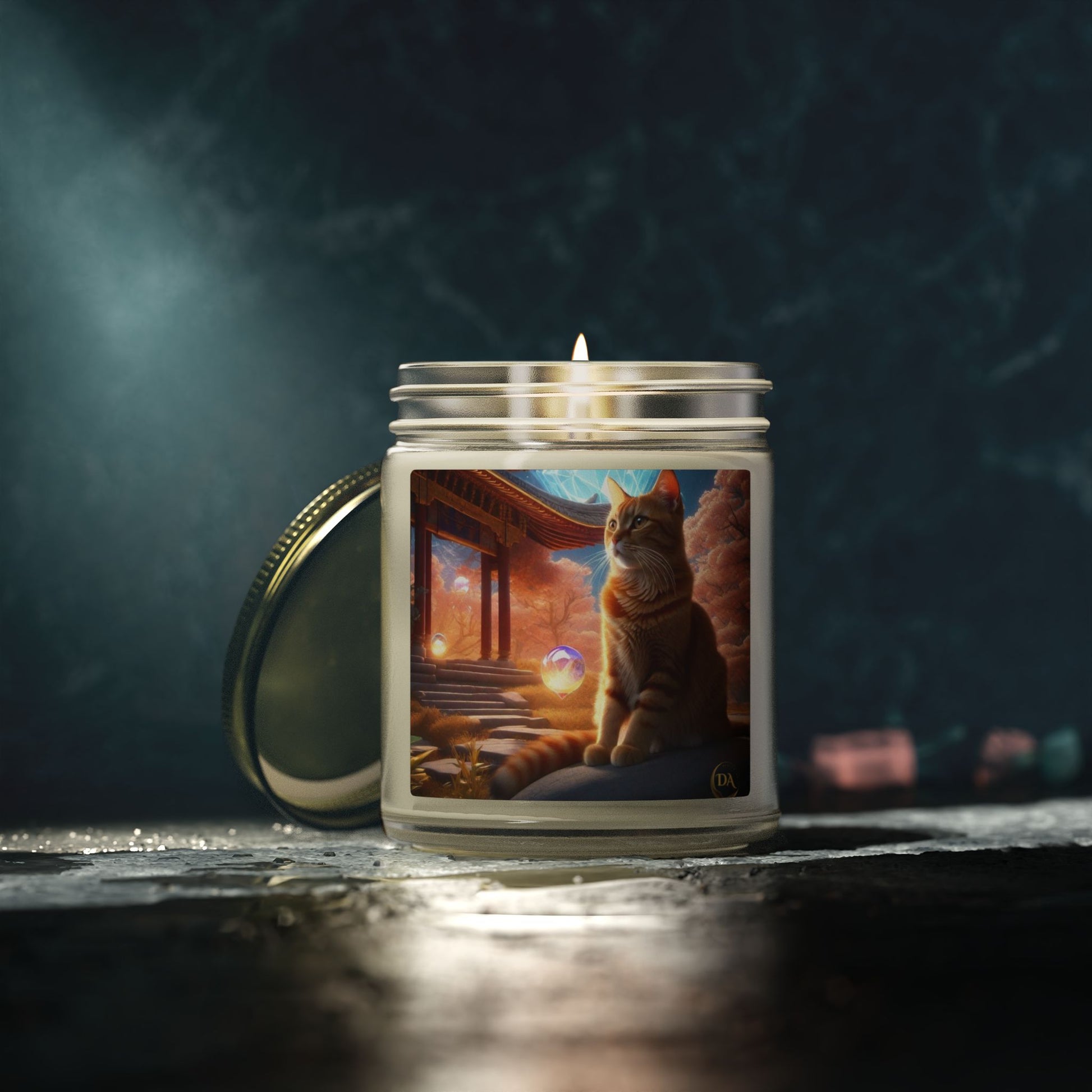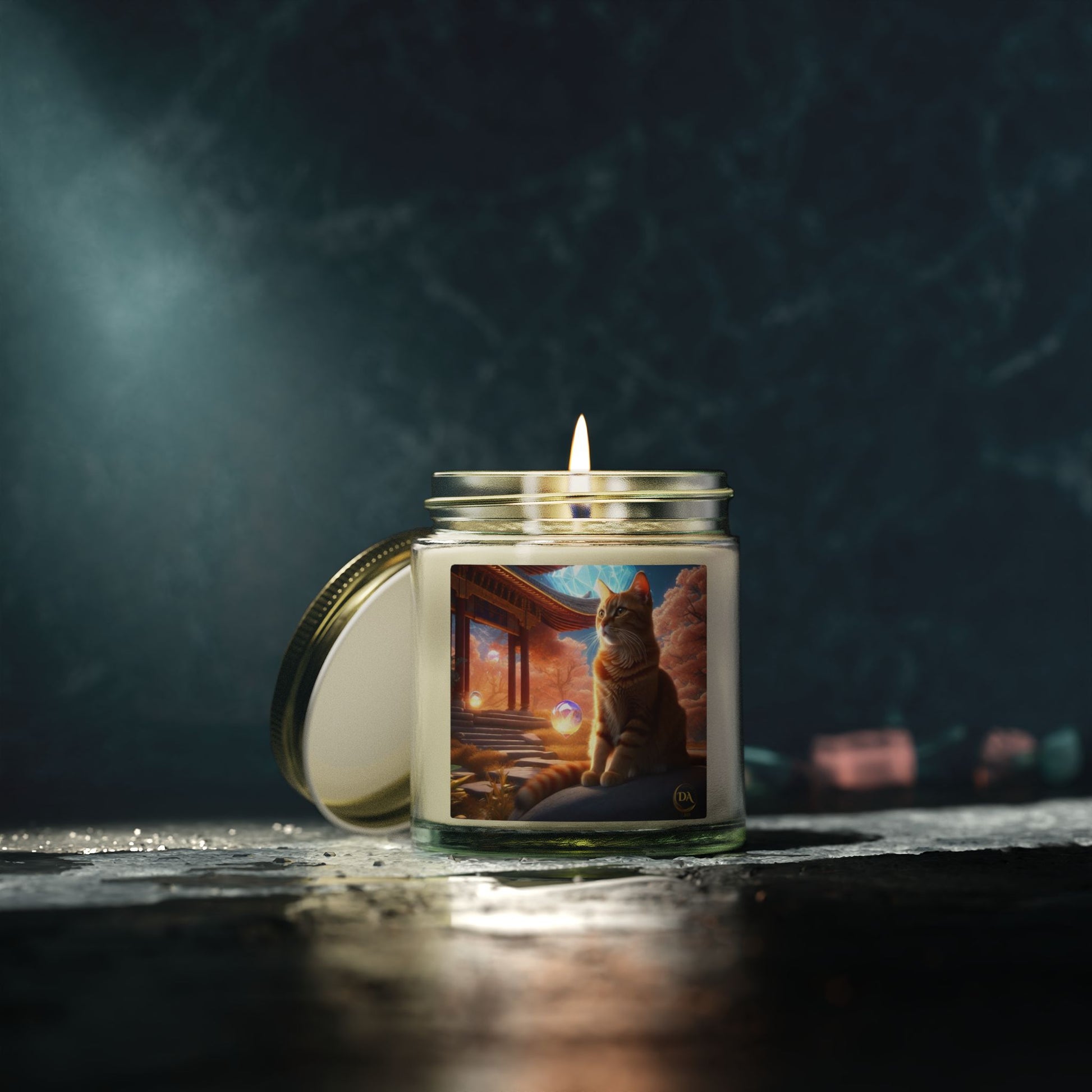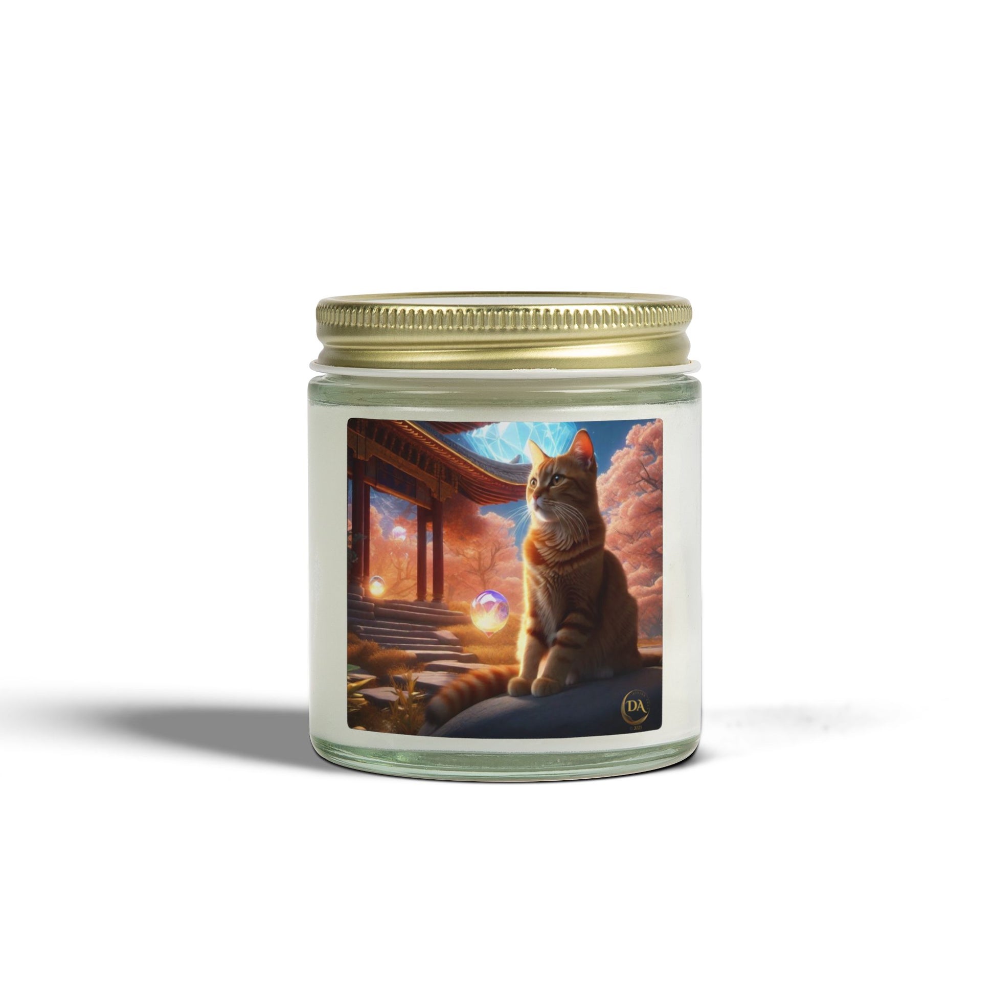 Premium Coconut Apricot Wax Scented Candles, Various Floral & Spice Fragrances (4oz), Spiritual Christmas Holiday Cat Lover Pet Gift, Ginger Tabby Cat Buddhist Diamond Sutra Temple Art, by Divine Arts