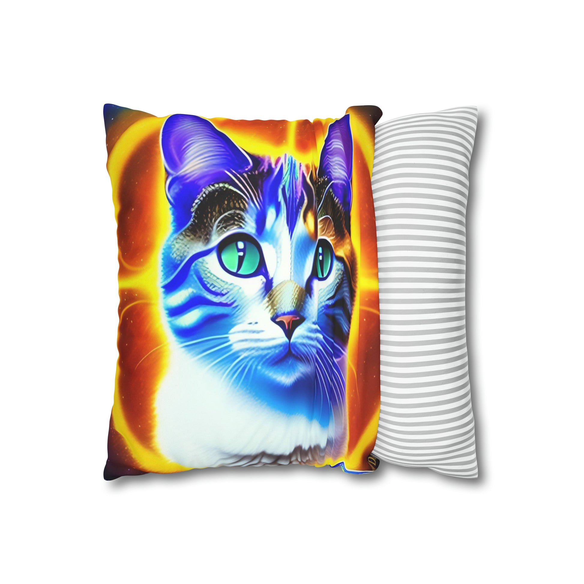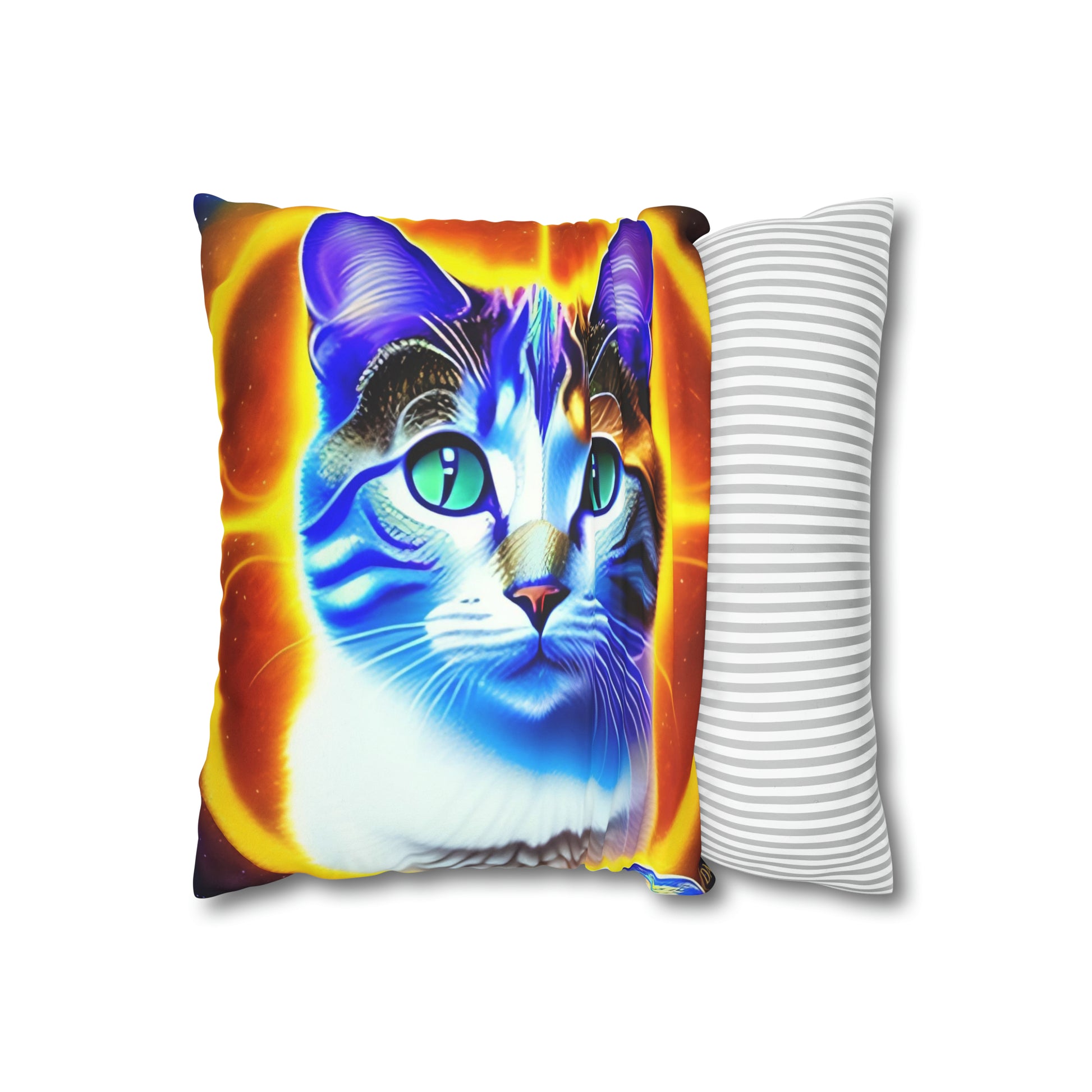 Divine Arts Faux Suede Double-Sided Square Pillow Case - Fantasy Galaxy Space Cat Lover Large Close Up View of the Face of a Female Brown Tabby Cat with Green Eyes With a Pulsing Yellow Orange Aura From Weilding the Merkaba Pillow Cover in Four Sizes