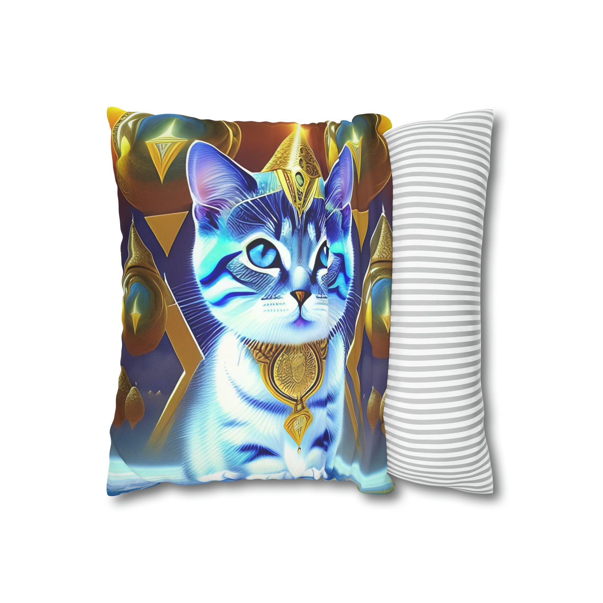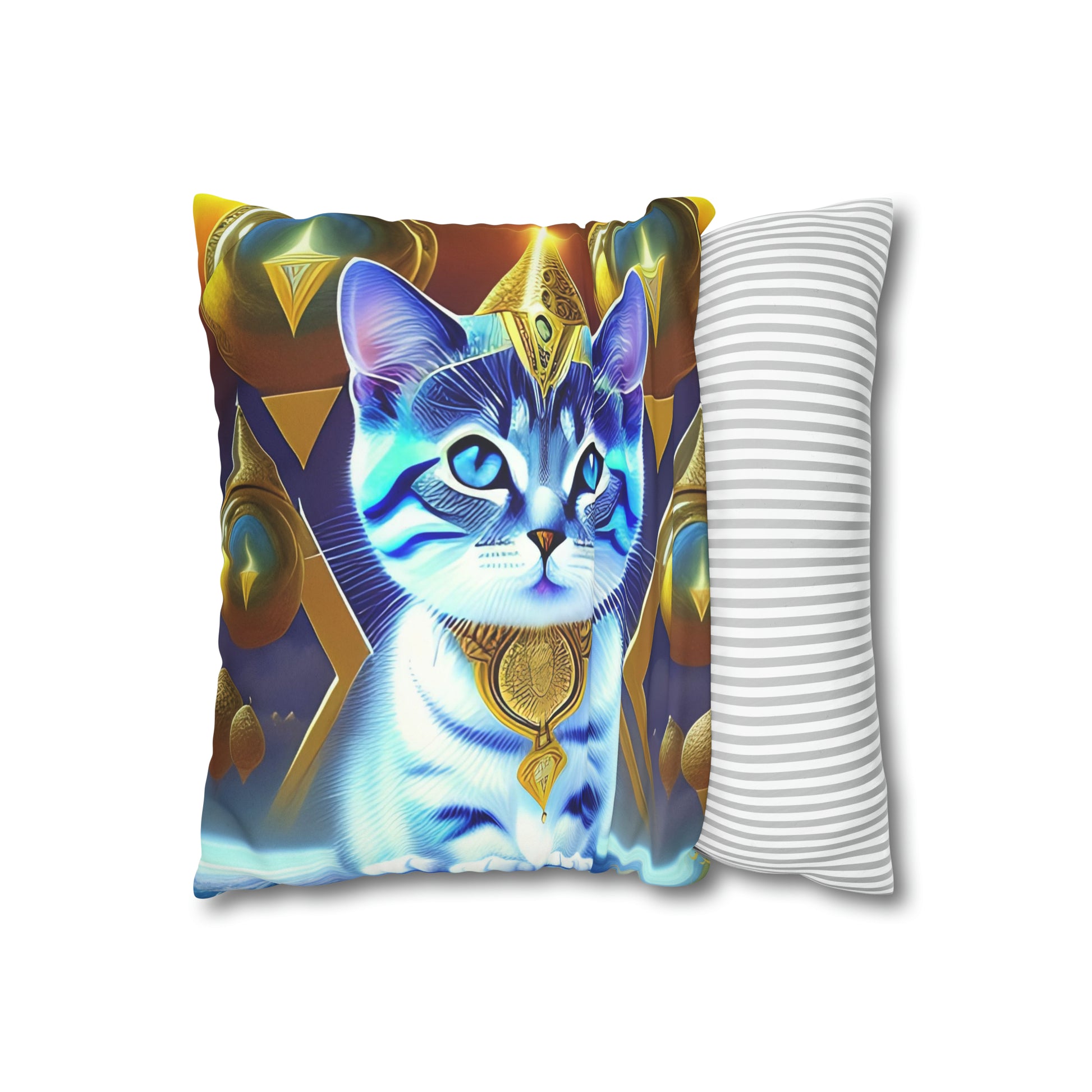 Divine Arts Faux Suede Double-Sided Square Pillow Case in Four Sizes - Fantasy Galaxy Space Cat Lover Male Gray and White Tabby Kitten with Blue Eyes in Golden Merkaba Chamber Wielding the Merkab