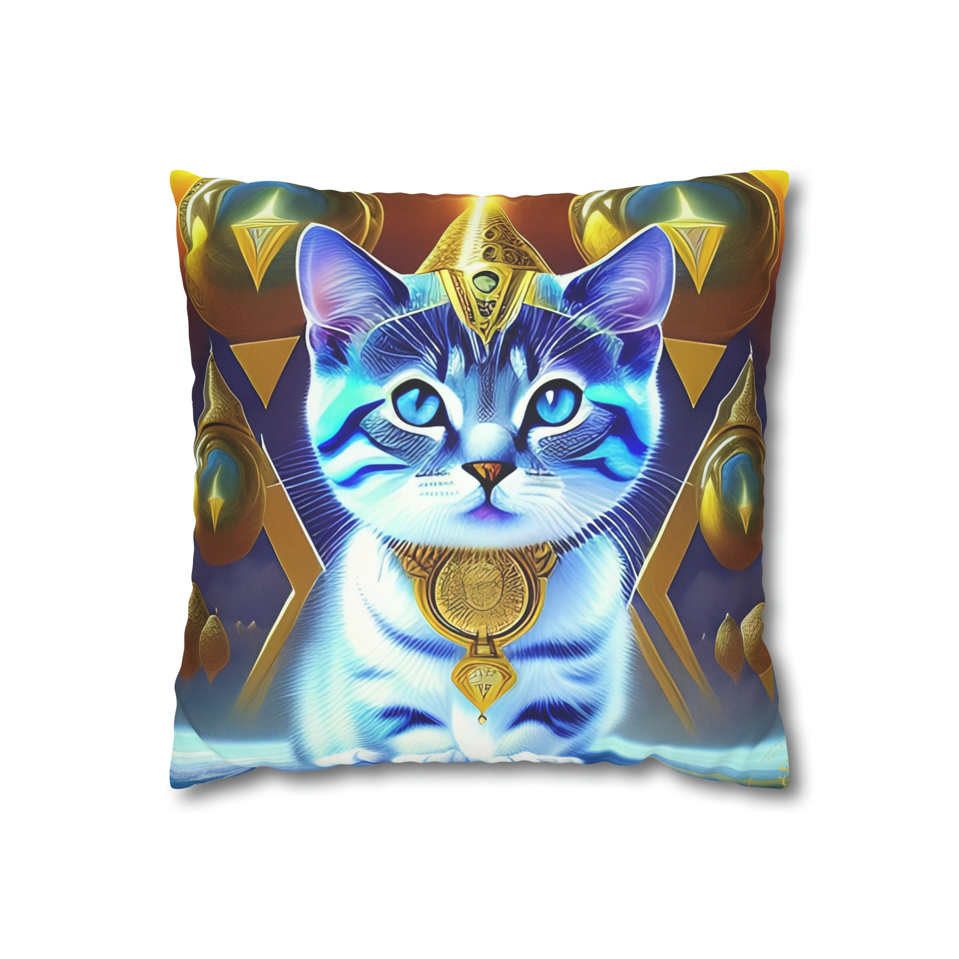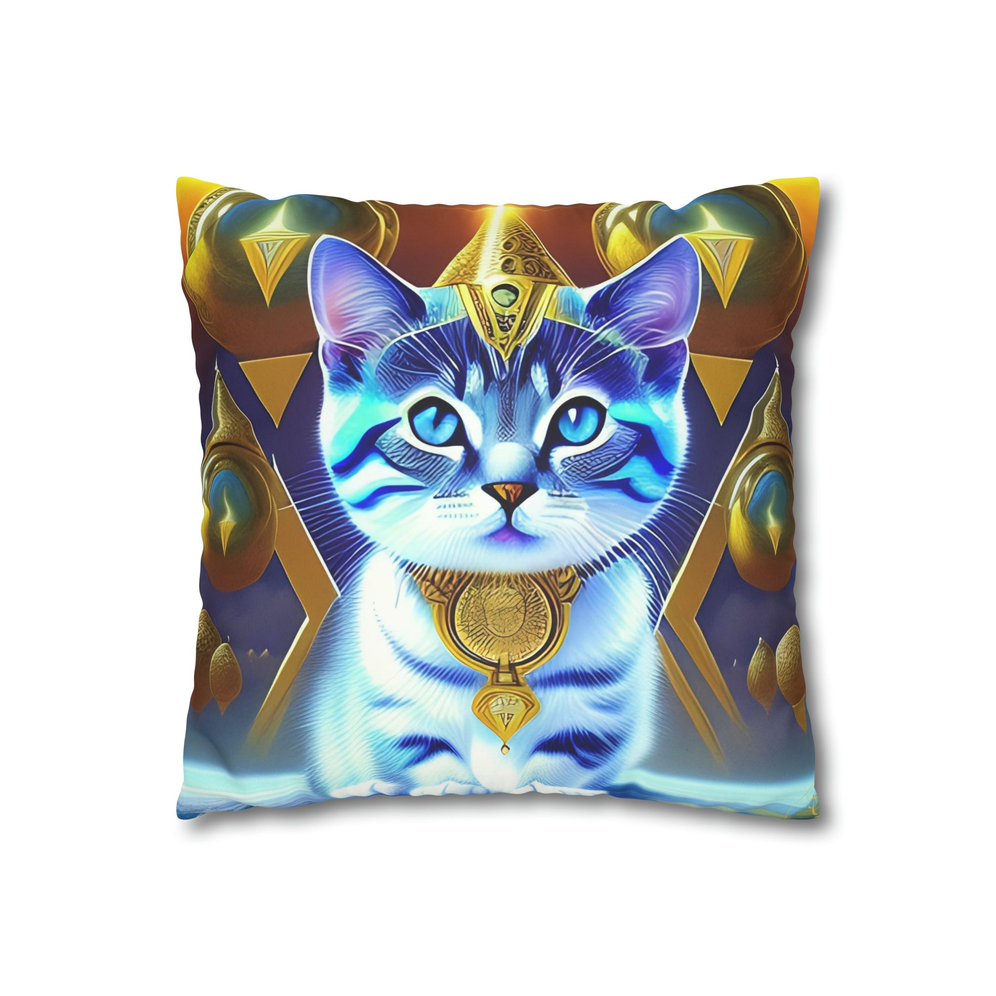 A definite statement piece, this indoor, 100% faux suede, double-sided print pillow cover is avaliable in various sizes and features a vibrant spiritual portrait of a male gray and white tabby kitten with blue eyes in deep meditative trance in a golden merkaba chamber wielding the merkaba,the infinite light body link to all sentient life shields.