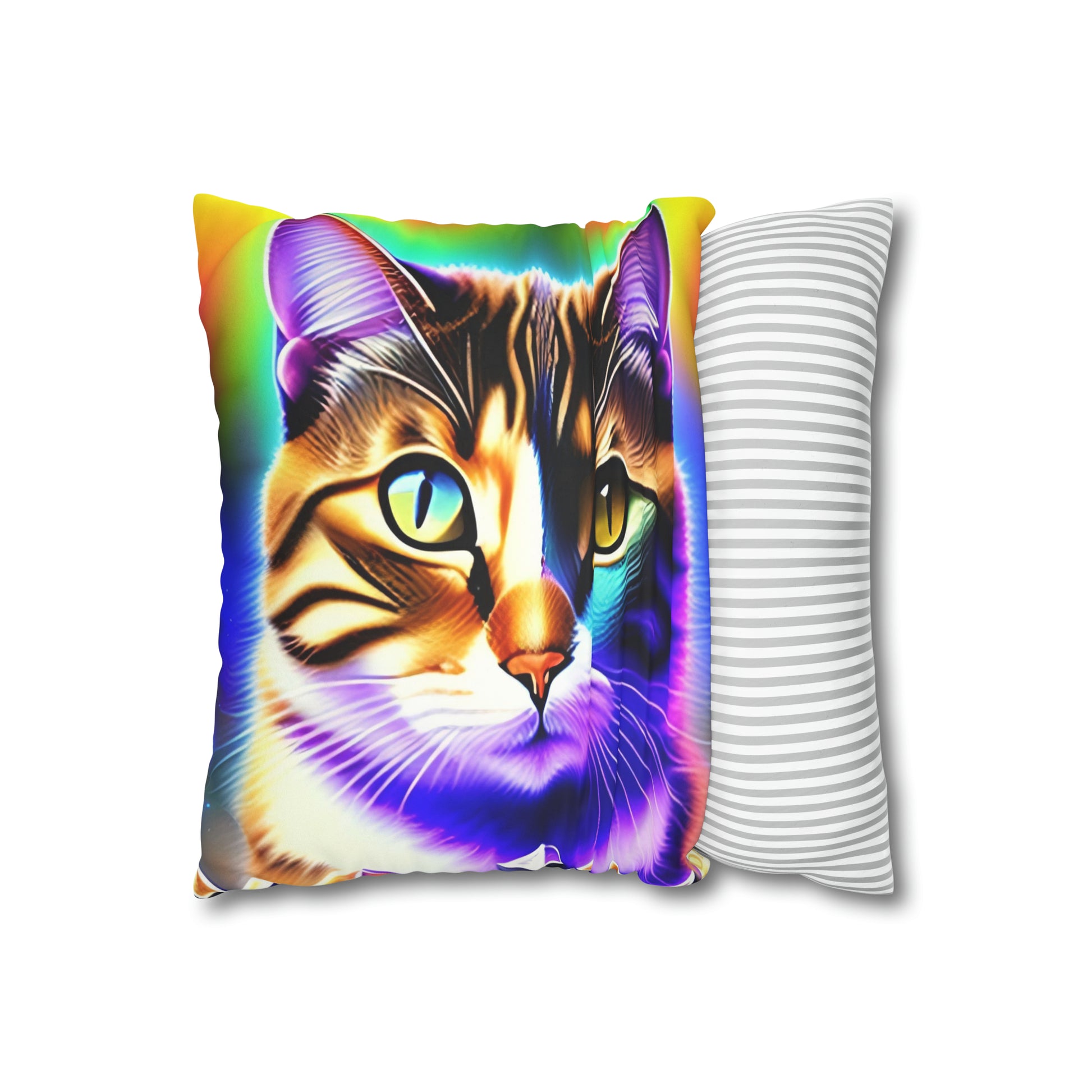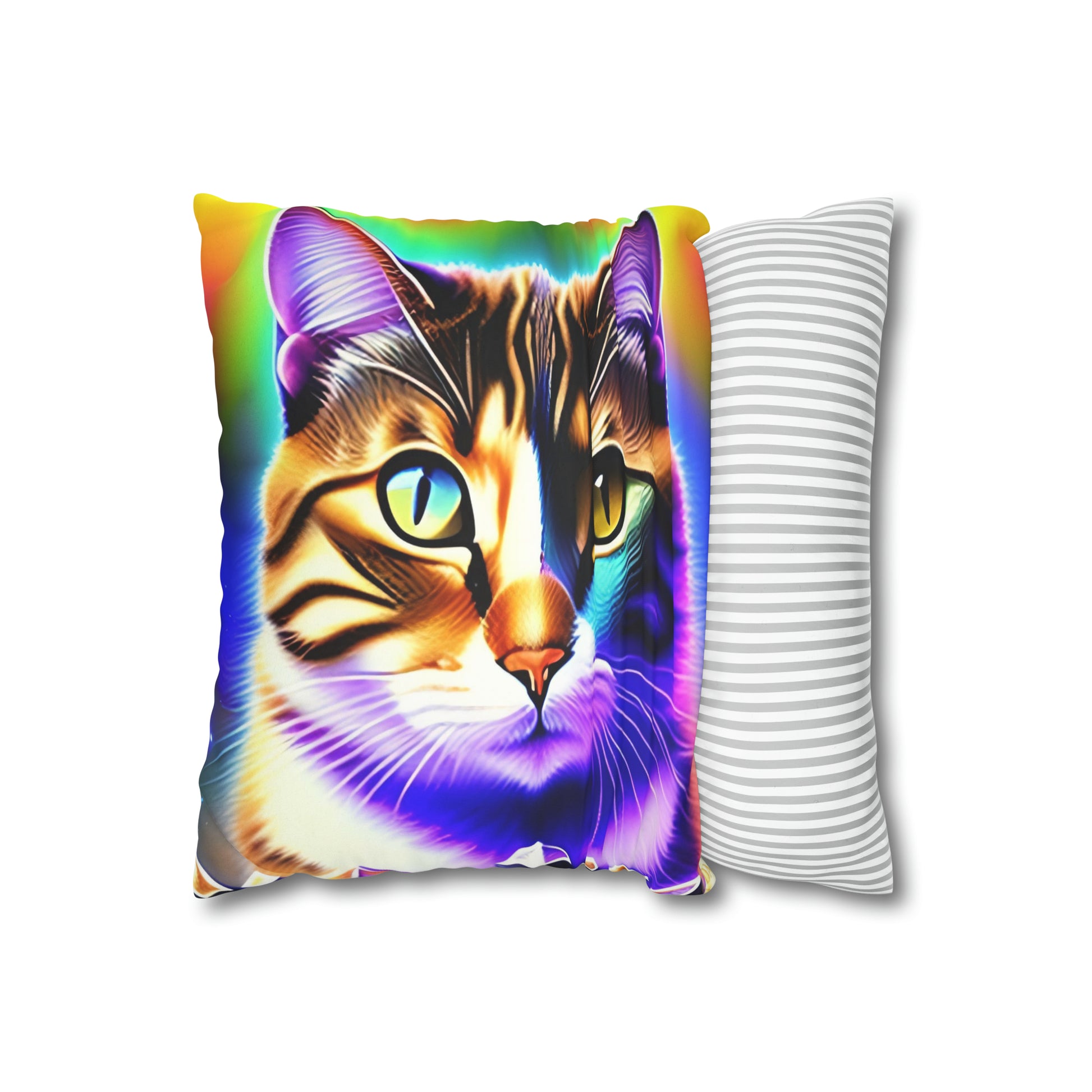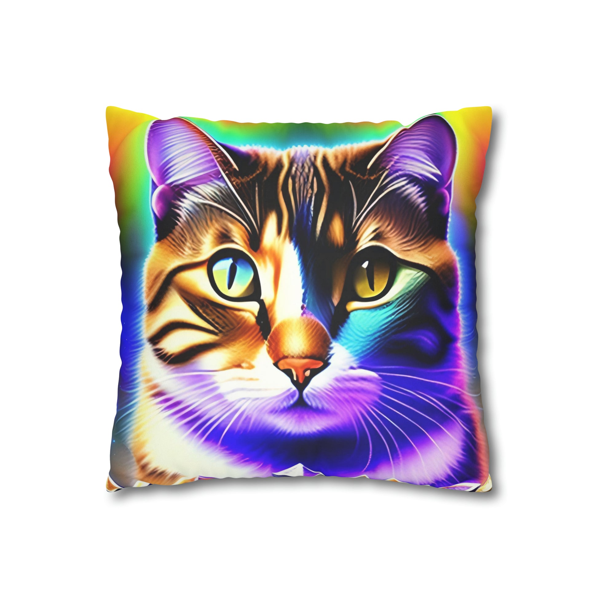 A definite statement piece, this indoor, 100% faux suede, double-sided print pillow cover is avaliable in various sizes and features a colorfully vivid spiritual portrait of a brown tabby cat with heterochromiia (i.e. one yellow-blue and one brown eye) immersed in rainbow light during meditation on the merkaba, the light body link to Earth's energy and sentient life shields.