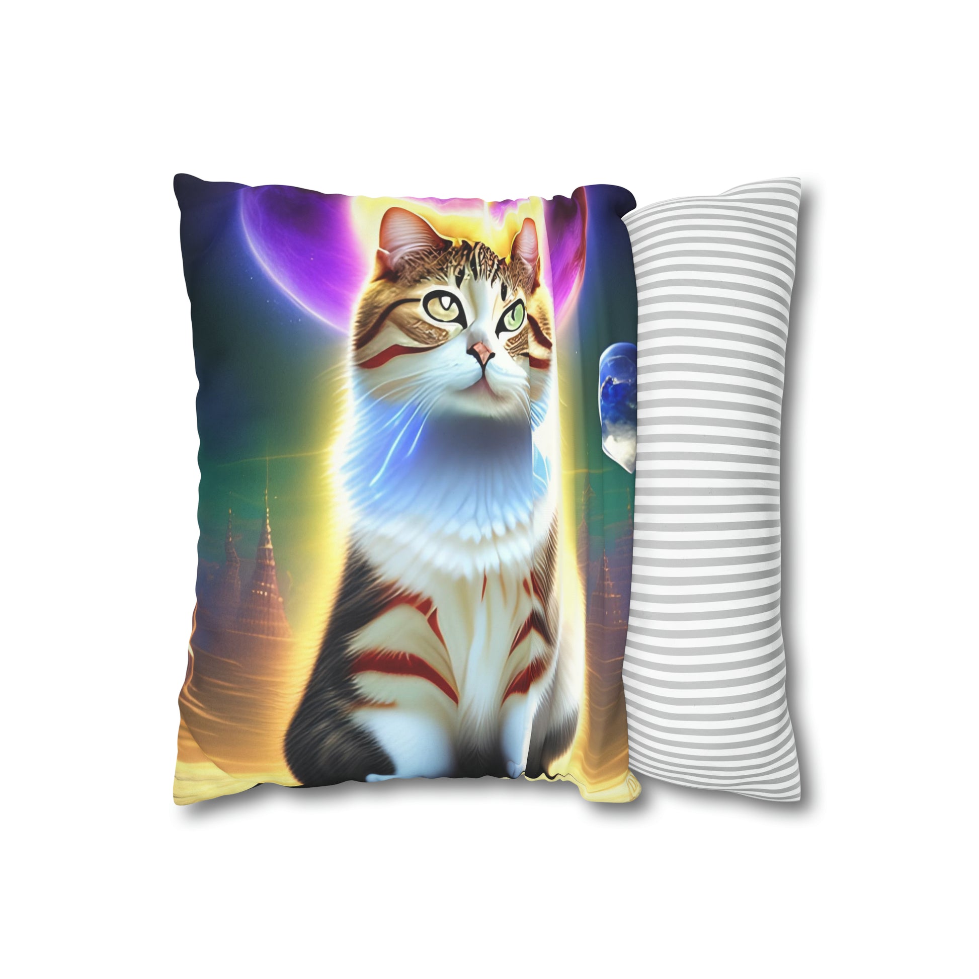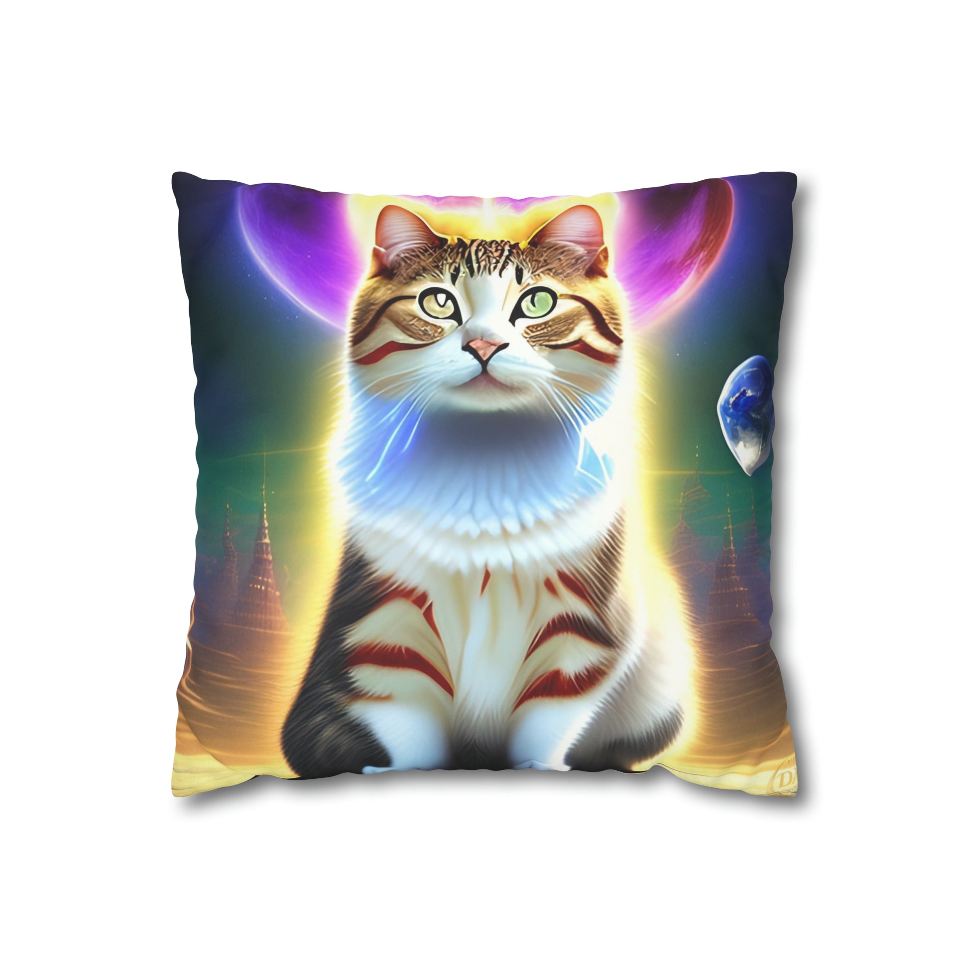 Divine Arts Faux Suede Double-Sided Square Pillow Case - Fantasy Galaxy Space Cat Lover Female Brown and White Tabby Cat with Heterochromia and a Bright Yellow & Purple Aura Spiritual Pillow Cover in Four Sizes