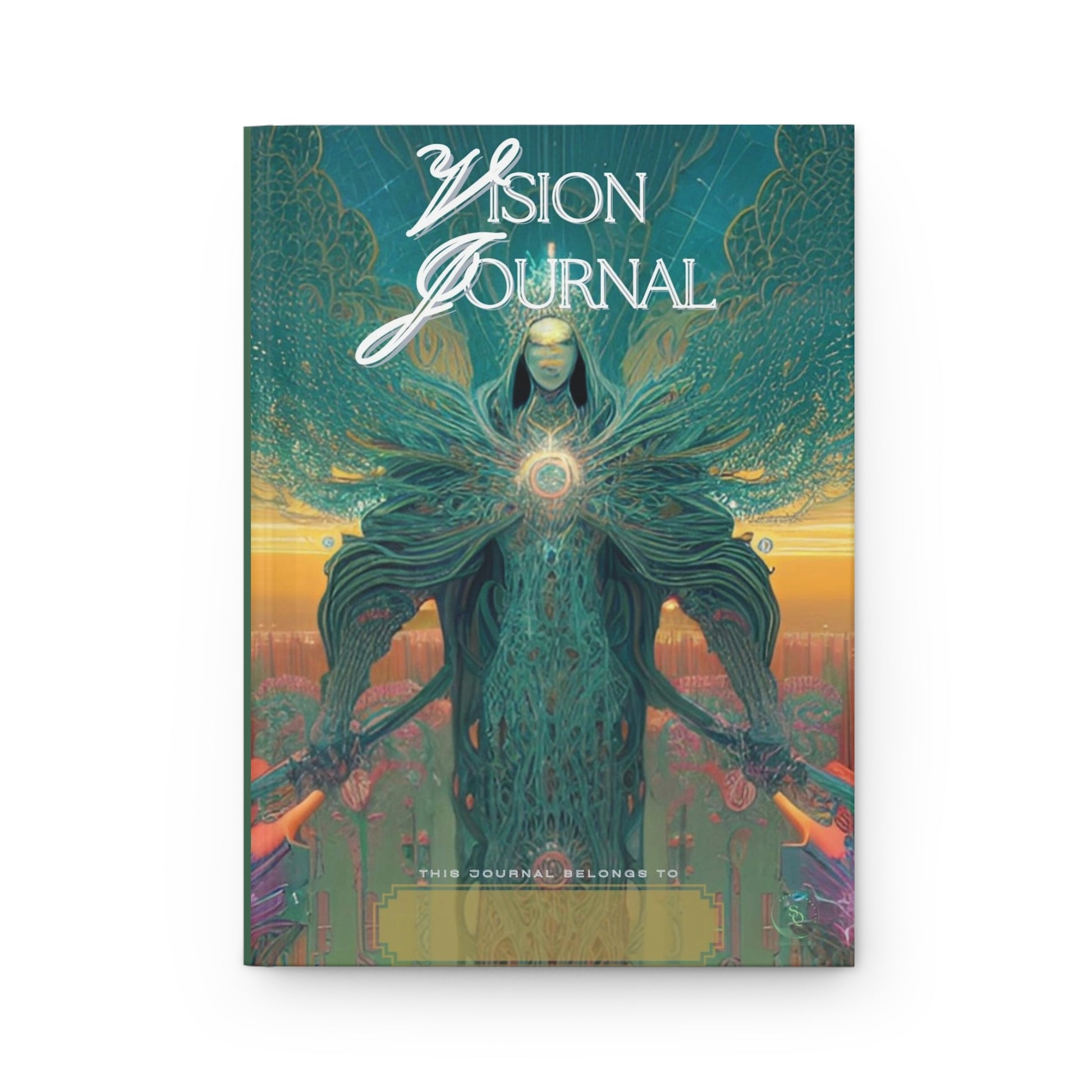 Set your manifestations in this Vision Journal and jot down important goals to for achieving important benchmarks. The large front view displays a smooth forest green colored Valkyrie celestial being wielding two pink plasma light weapons with long wispy tendrils of ascending wings as it guards the city below at sunset.