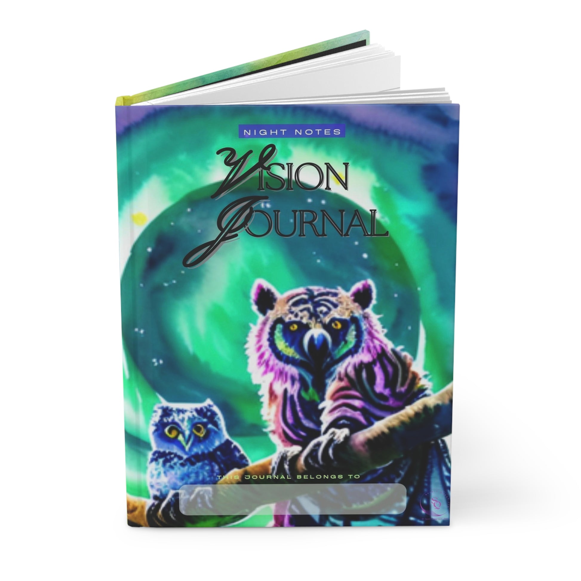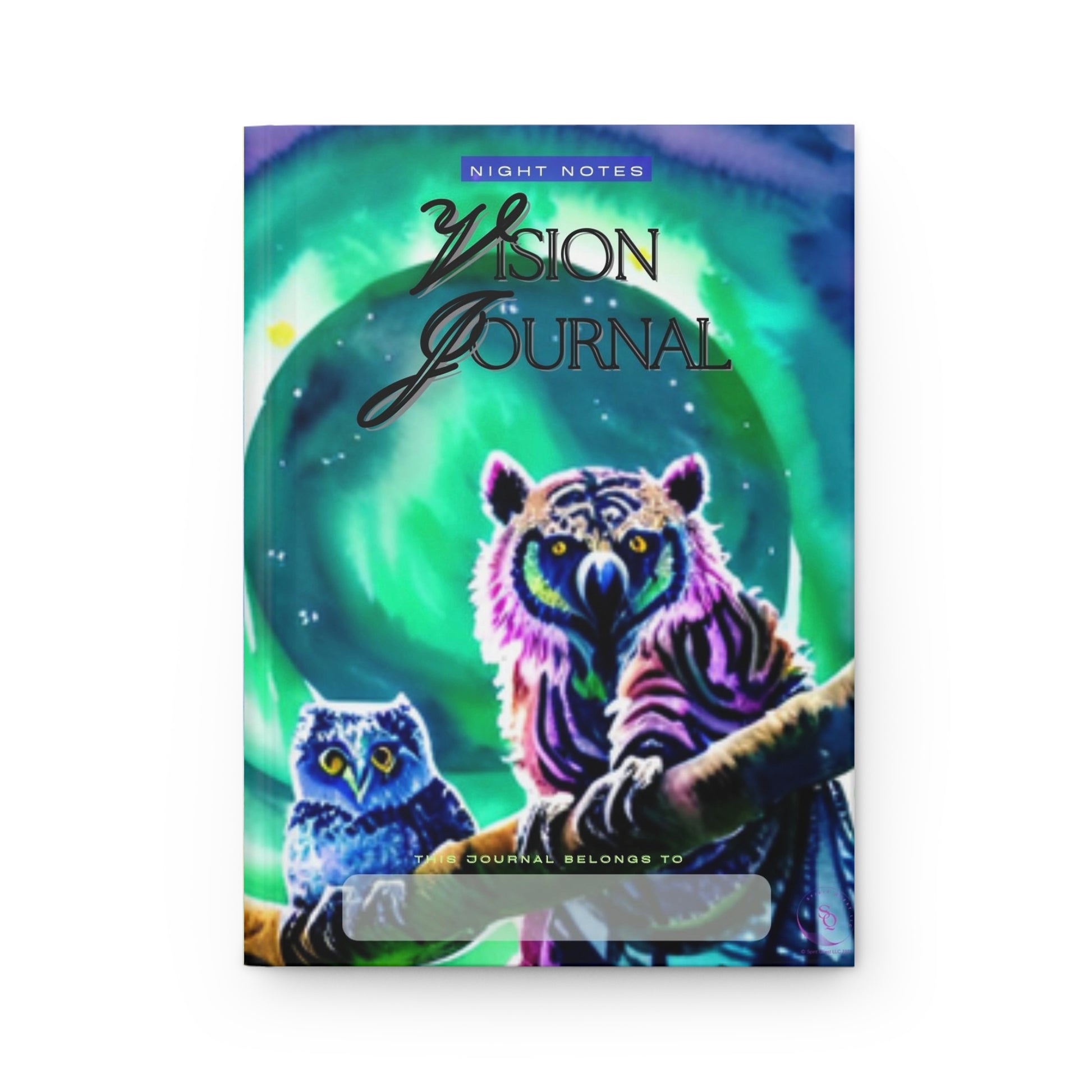 Jot down important goals and draw inspiration from the calm repose of the purple and blue owl pair peacefully perched along a diagonal tree branch while the electromagentically charged aurora borealis circles in streams of cosmic bursts of green hues awash in the night sky overhead in this vivid watercolor Vision Journal. ๐ฆ๐๐