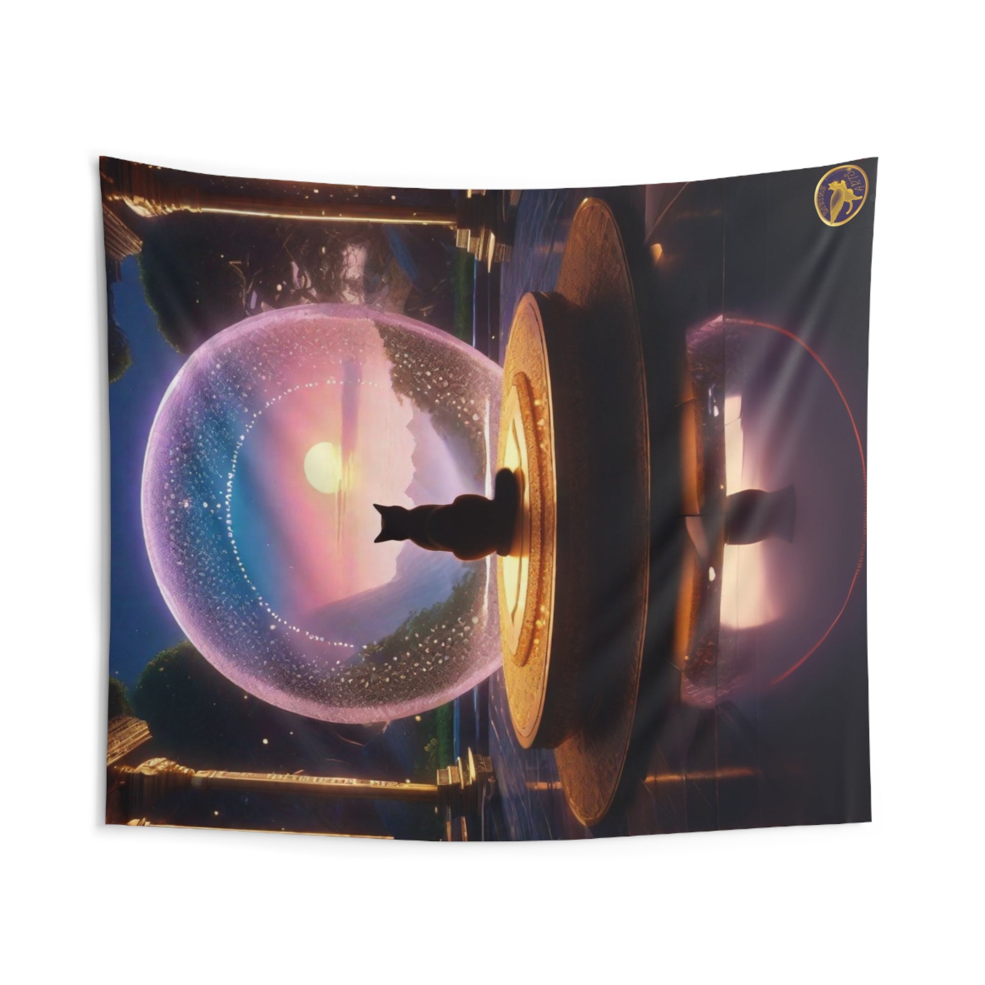 Indoor Polyester Wall Tapestry (88"X 104"), Silouhette of Large Cat Sitting on a Temple Platform Observing an Immense Lavendar Crystalline Bubble with Sunset Pastel Ombres and Moutainscape Background, Diamond Sutra Art, by Divine Arts