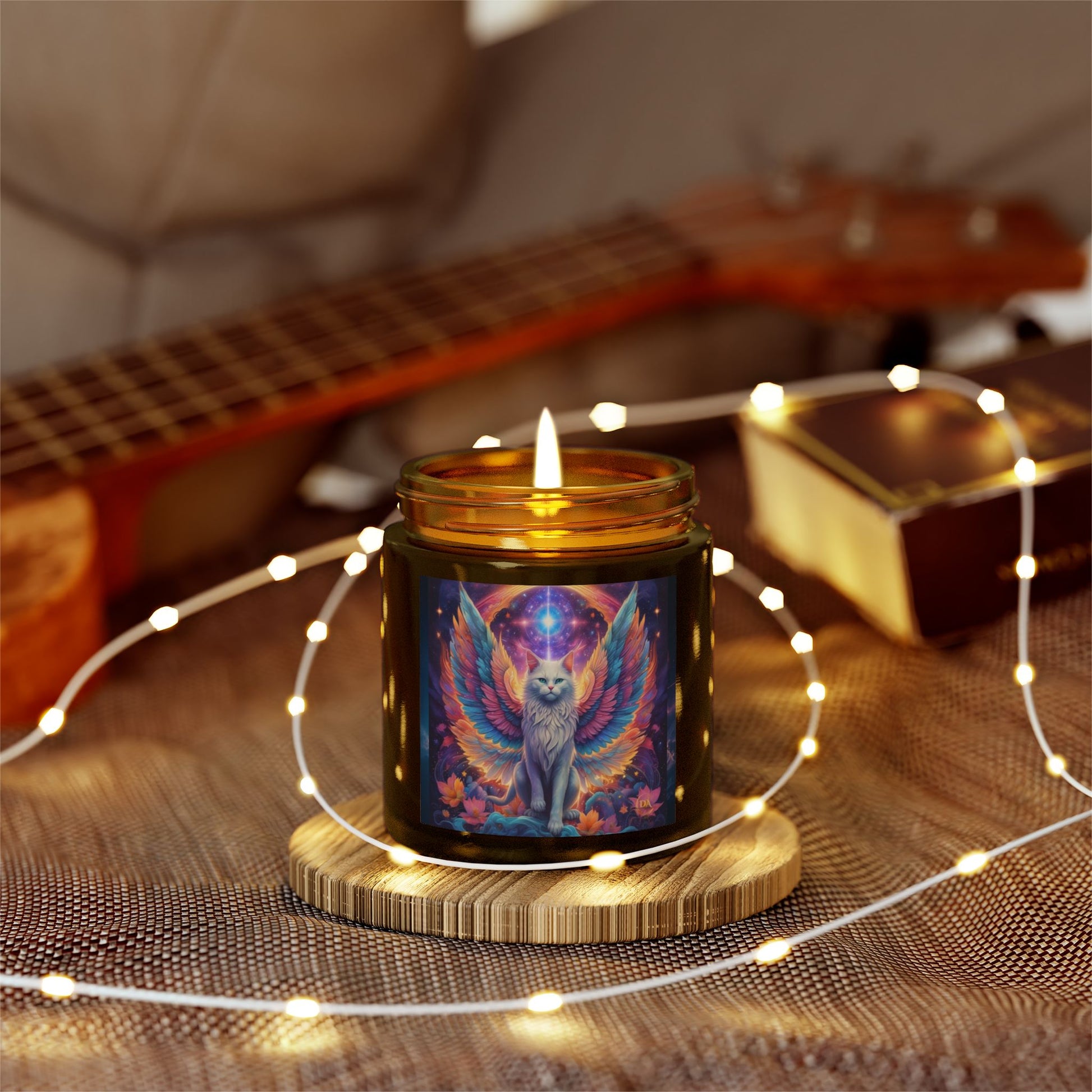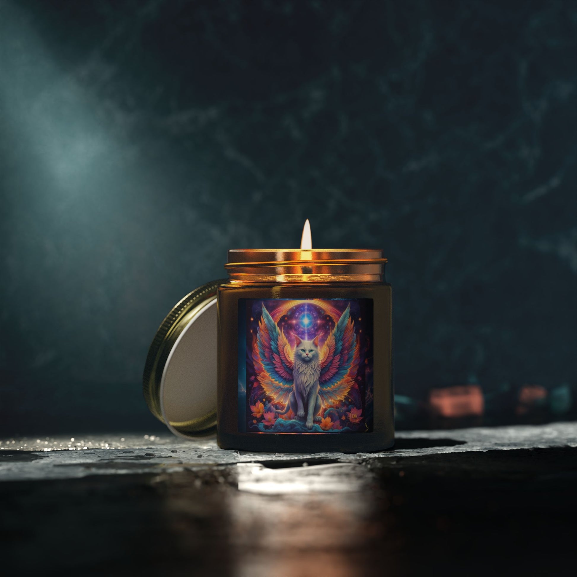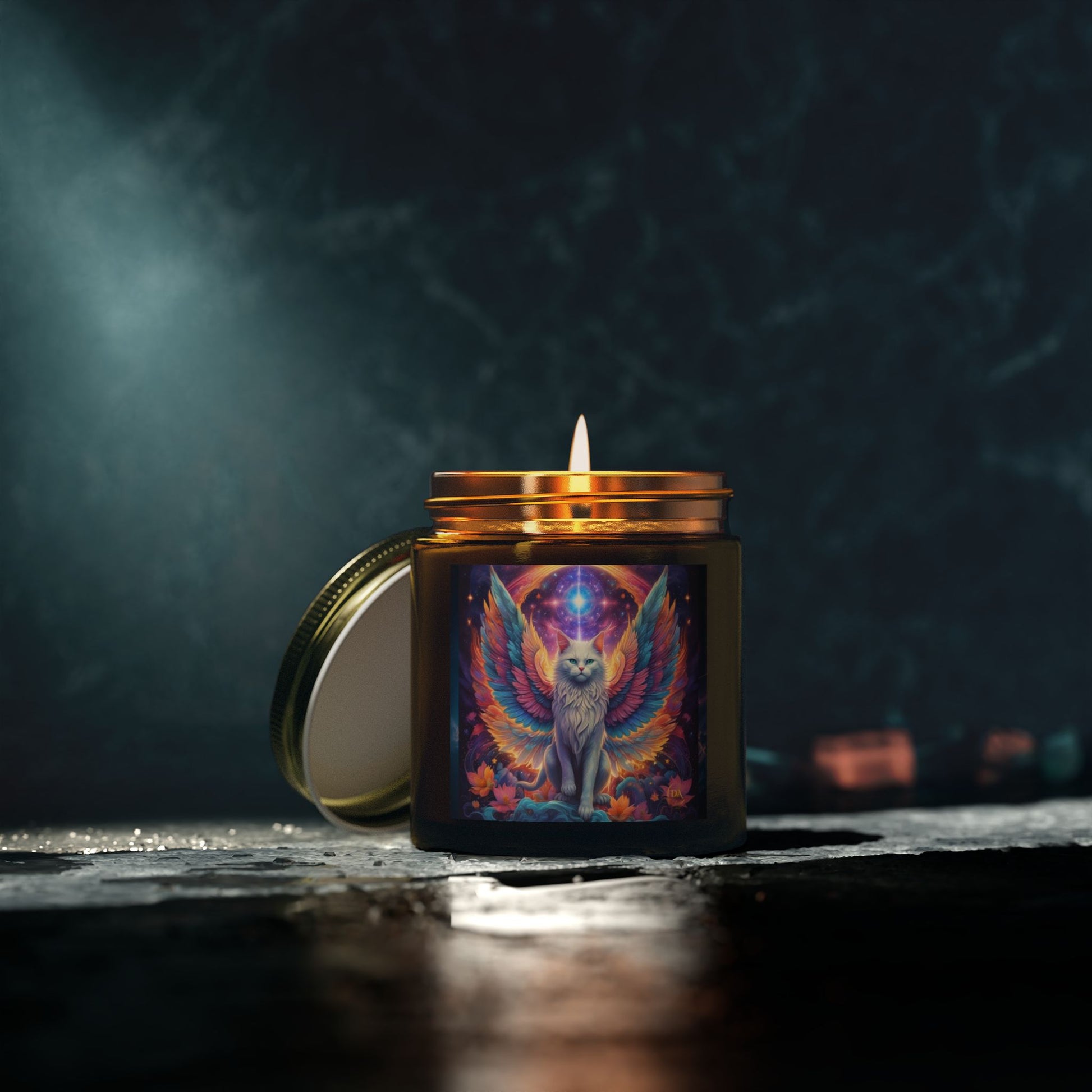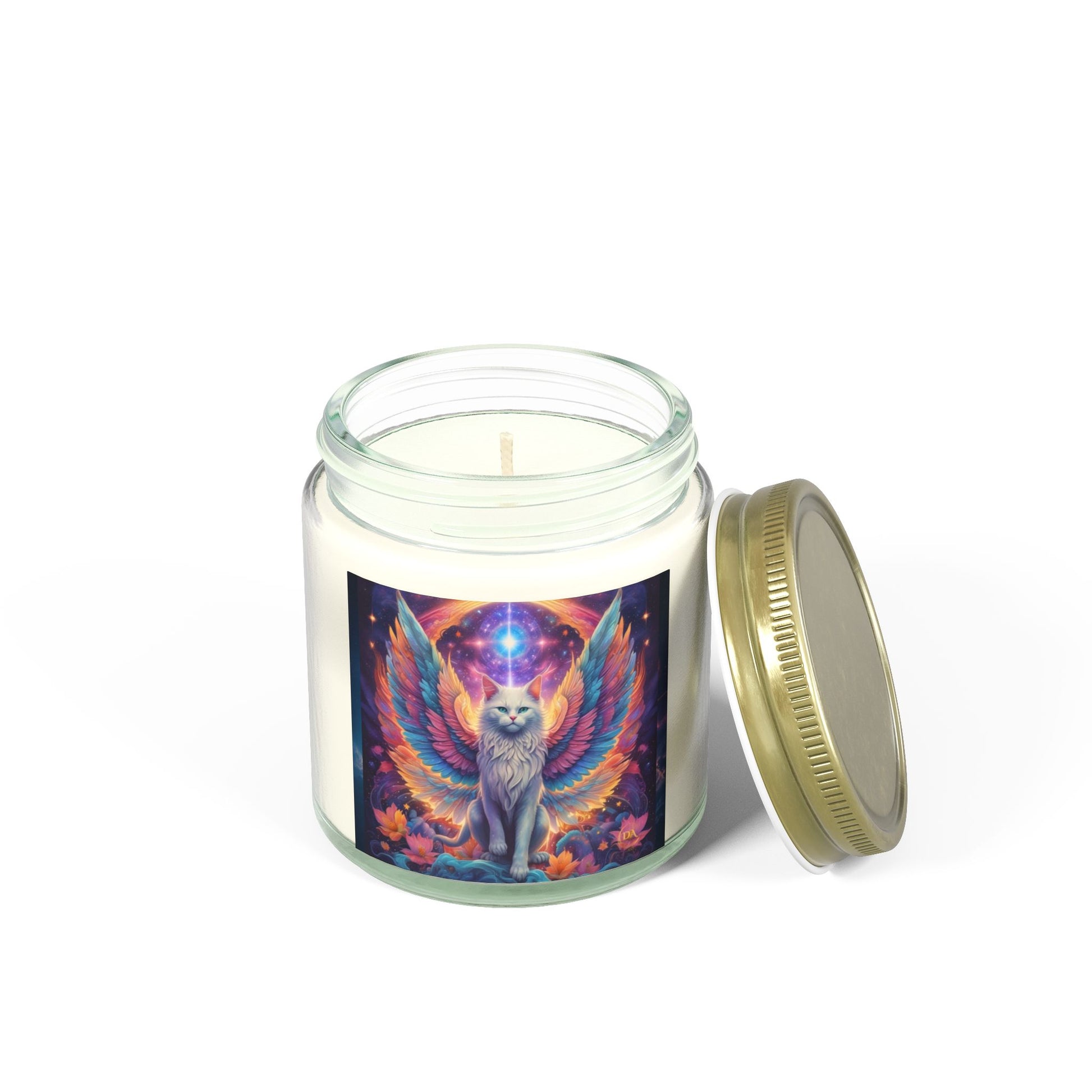 Premium Coconut Apricot Wax Scented Candles, Various Floral & Spice Fragrances (4oz), Spiritual Christmas Holiday Cat Lover Pet Gift, Galaxy Space White Angel Cat Art, by Divine Arts