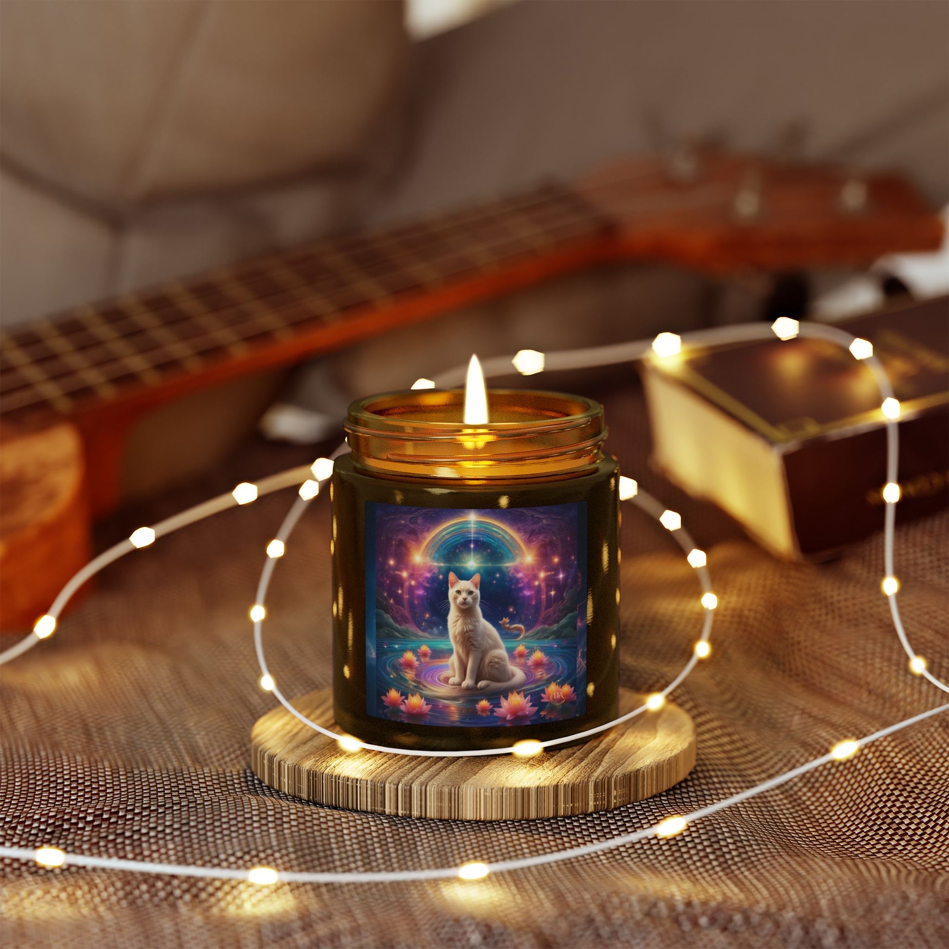 Premium Coconut Apricot Wax Scented Candles, Various Floral & Spice Fragrances (4oz), Spiritual Christmas Holiday Cat Lover Pet Gift, White Brown Cat in Sparkling Rainbow Lotus Field Pool, Fantasy Galaxy Space Cat Art , by Divine Arts