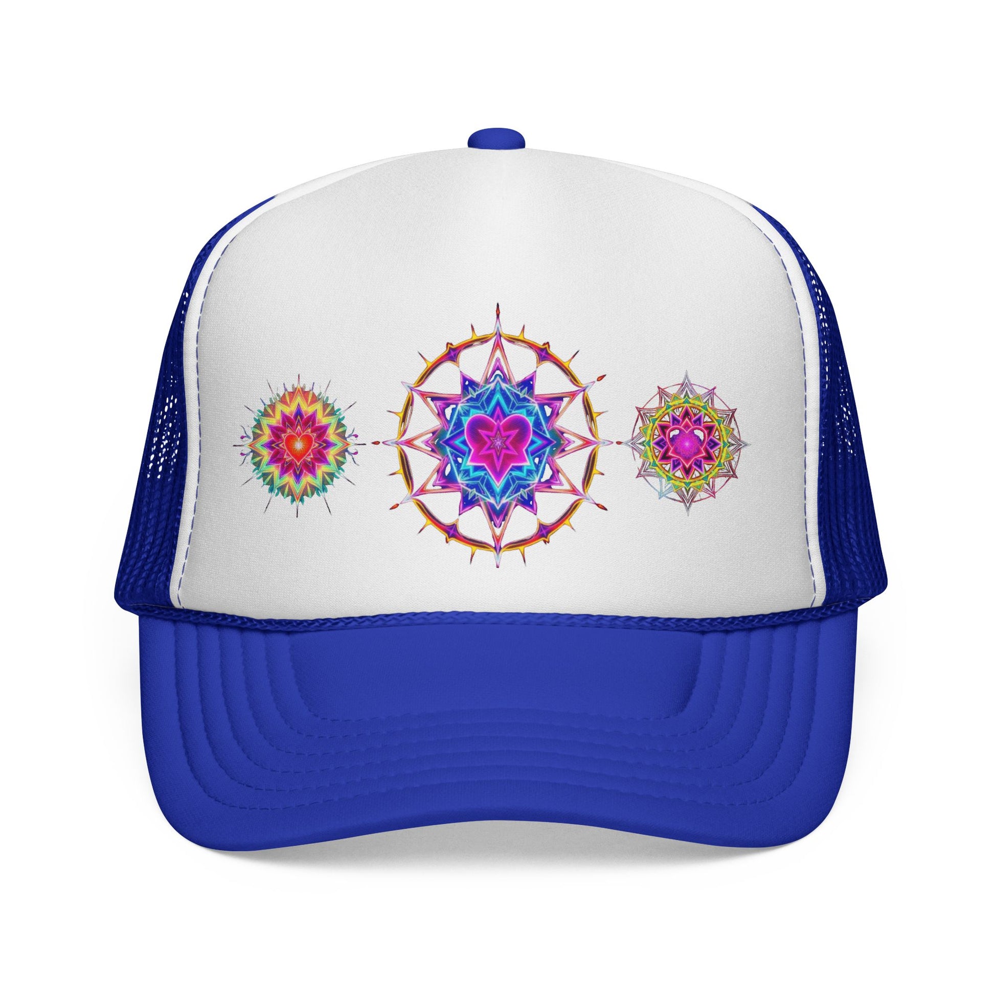 A bold, colorful trucker cap that brings cosmic energy to everyday wear. The foam front showcases a cosmic neon geometric merkaba print that seems to glow against the white panel, while the breathable nylon mesh back keeps you cool on sunny days. ย As the merkaba is the eternal conscious light body, whether it's a festive break or or running side errands, the merkaba thinking cap emits a visual frequency that reminds one that awareness is always key. ย ๐๐๏ธ